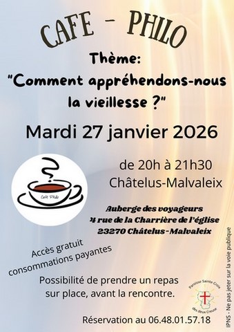 - Mardi 27 janvier 2026 de 20h à 21h30 : Café-philo à l’Auberge des Voyageurs à Châtelus-Malvaleix : « Comment appréhendons-nous la vieillesse ? »