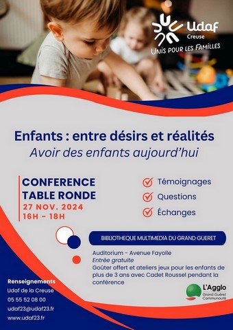 La Conférence départementale de la Famille se déroulera le mercredi 27 novembre 2024 de 16h à 18h, à la Bibliothèque multi-média du Grand Guéret (Auditorium - avenue Fayolle).