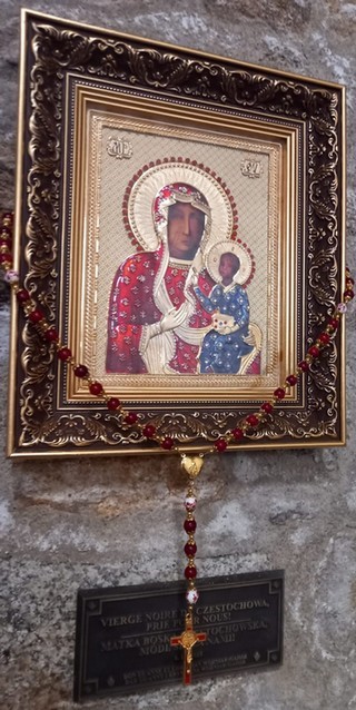 Photos (cliquer sur l'imagette de votre choix, puis cliquez sur la photo pour l'agrandir) : 1- le clocher ; 2- la nef et sa voûte en châtaignier, en forme de carène de bateau ; 3- statue de la Déploration du Christ ; 4- Copie de l'icône de la Vierge Noire de Czestochowa (Pologne).