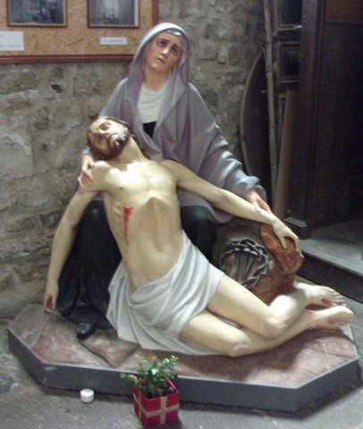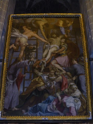 Photo 1 : La « Descente de Croix », copie d'une peinture murale de Daniel de Volterra (peintre italien réputé, ami de Michel-Ange), a été replacée dans l'église en octobre 2018 après restauration. La fresque murale originale, peinte vers 1545 sur des ébauches de Michel-Ange, puis détachée du mur et fixée sur un tableau en 1809, est dans l'église de la Trinité des Monts, à Rome.