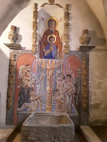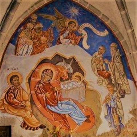 Photo 3 : fresque de la Nativité par Nicolaï Greschny : au centre, l'enfant Jésus couché dans la mangeoire, réchauffé par l'âne et le boeuf ; en bas à gauche, St Joseph et la Ste Vierge ; en bas à droite, les bergers (dont un qui joue de la flûte) ; en haut au centre, un ange ; en haut à gauche, les trois rois mages.