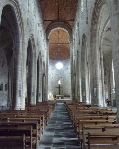 La nef centrale, du XII° siècle, est romane, donc à voûte en "plein cintre" (c’est-à-dire en demi-cercle). Elle est prolongée par une travée plus basse qui, au XVI° siècle, a remplacé le choeur primitif, et par le chœur actuel. Ces deux parties sont gothiques, avec croisées d’ogives. Il en est de même des voûtes des bas-côtés, datées des XV° et XVI° siècles.
