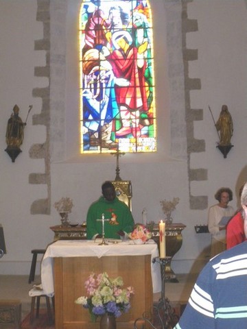 Ci-contre : Messe de la fête de Ste Radegonde 2019 en l'église des Mars. Le vitrail derrière l'autel représente St Médard (à droite, avec une auréole et un vêtement rouge) qui donne son cheval à un chevalier pauvre (à gauche, en bleu). Le cheval est au second plan, à gauche. Cliquer sur l'image pour l'agrandir.
