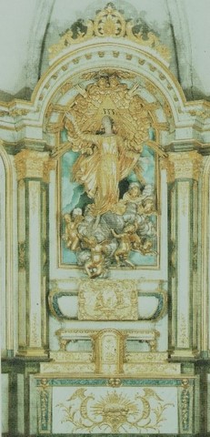 Ci-contre une vue de l'autel avec son tabernacle, surmonté d'une sculpture représentant la Vierge Marie montant au Ciel (Assomption) ; le triangle au-dessus de sa tête symbolise la Trinité. Bois peint imitation marbre et dorures, époque baroque finissant (XVIII° siècle).