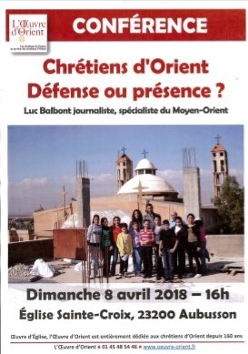 Conférence sur "Chrétiens d'Orient : Défense ou présence" par Luc Balbont, spécialiste du Moyen-Orient, le 8 avril 2018 à 16h à l'église Ste Croix d'Aubusson, en conclusion de l'exposition (voir affiche ci-dessus à droite).