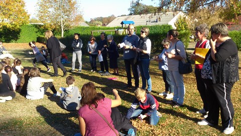 Une cinquantaine d'enfants, accompagnés de parents et de catéchistes, arpentent les rues à la recherche de mots qui vont baliser leur chemin... chemin qui mène à Pâques en ce début de Semaine Sainte. Par petits groupes, ils sont partis avec leur feuille de route ; et voici les mots qui ont balisés leur route :