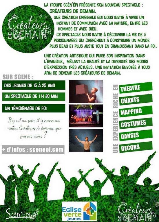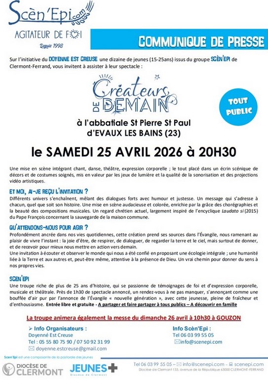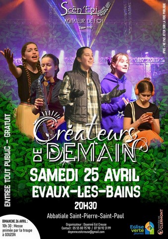 - Samedi 25 avril 2026 à Evaux les Bains à 20H30 : Concert-spectacle « Créateurs de demain » (voir ci-contre et ci-dessous - cliquer sur l'affiche pour l'agrandir). Nous aurons le plaisir d'accueillir une équipe de France-Télévision qui filmera la soirée pour être diffusée dans l'émission "Le jour du Seigneur".