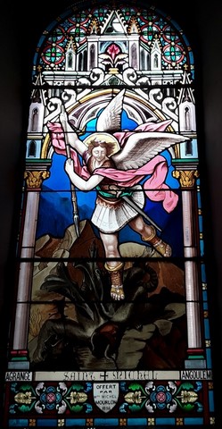 Vitrail de l'Archange St Michel - Eglise Notre-Dame de l'Assomption, Bellegarde (voir article ci-dessous). Cliquez sur l'image pour l'agrandir.