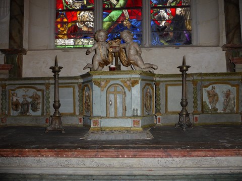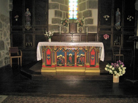 A remarquer à l'intérieur : les voûtes peintes et leurs nervures, le retable en bois de style baroque (Monument historique 1992), avec ses colonnes torsadées et le meuble du tabernacle en bois doré.